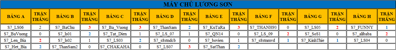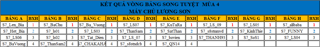 TỔNG KẾT BXH VÒNG BẢNG CỦA MÁY CHỦ LƯƠNG SƠN: