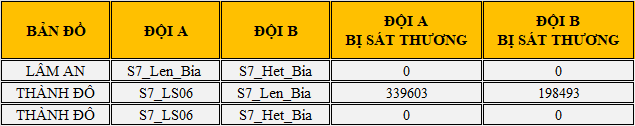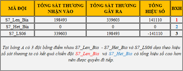 Tại bảng A có 3 đội bằng điểm trận thắng, tính kết quả dựa theo hiệu số sát thương như sau