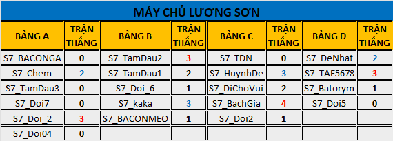 Tại bảng B có 2 đội bằng điểm nhau S7_TamDau2 và S7_kaka dựa theo thành tích đối đầu thì S7_TamDau2 đã thắng S7_kaka ở trận đấu tại thành Dương Châu lúc 19:20