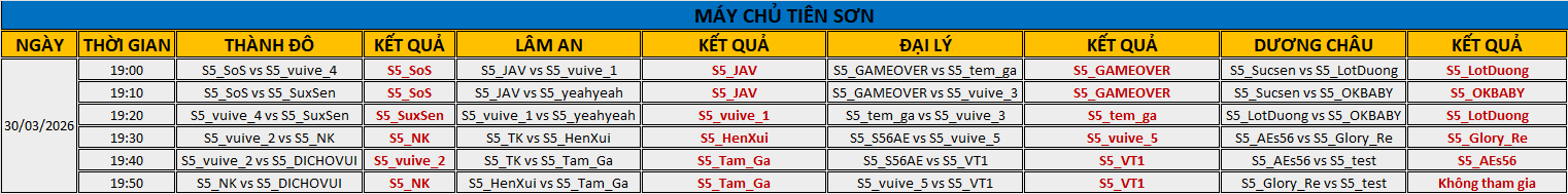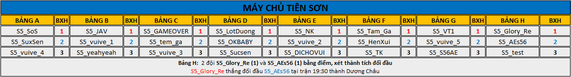 TỔNG KẾT BXH VÒNG BẢNG CỦA MÁY CHỦ TIÊN SƠN: