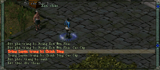 - B1: Chư vị đối thoại với NPC Thợ Rèn Thần Bí để chọn chức năng Trùng Luyện hoặc Trùng Luyện Cao Cấp