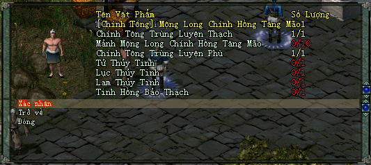 10 Mảnh Hoàng Kim Môn Phái (Tương ứng với trang bị cần trùng luyện) Chư vị cần chuẩn bị thêm 10 Mảnh Mộng Long Chính Hồng Tăng Mão Công thức đầy đủ sẽ là: |