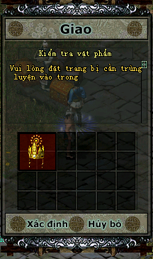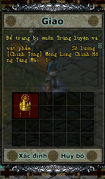 - B5: Xuất hiện khung xác nhận trang bị Chính Tông cần trùng luyện: chư vị vùi lòng đặt trang bị Chính Tông cần trùng luyện vào bên trong để xử lý, các nguyên liệu khác để trong hành trang nhân vật